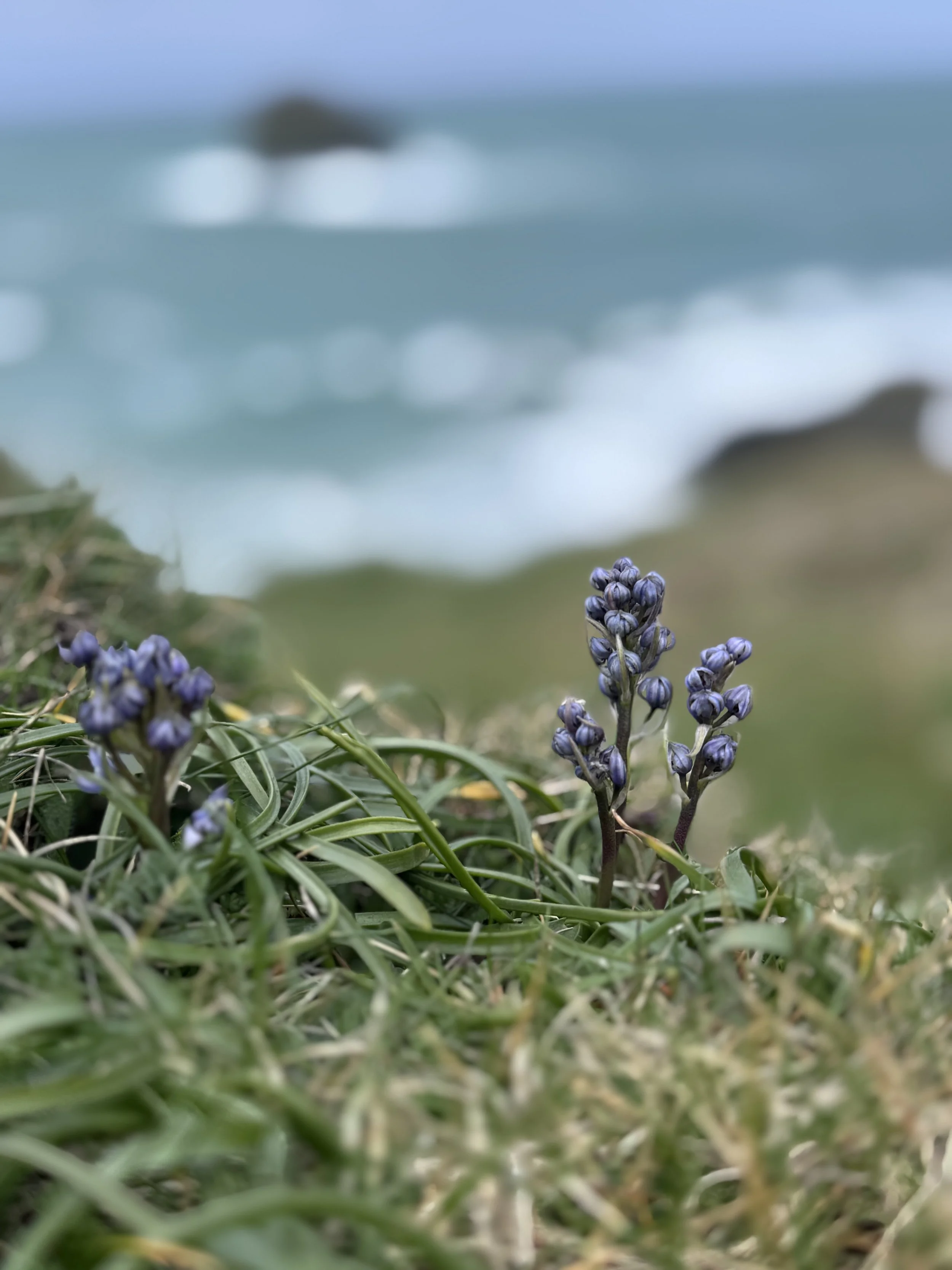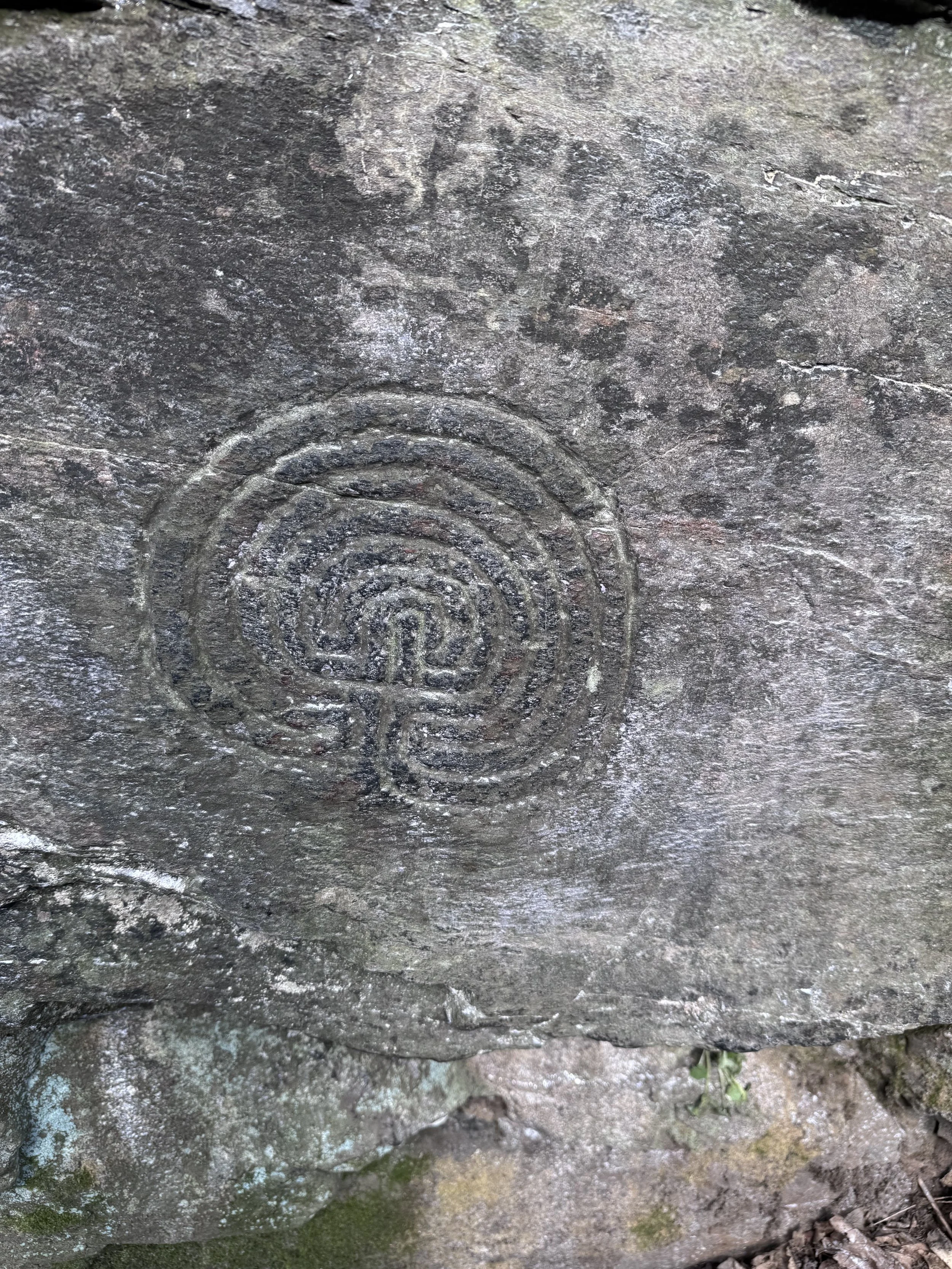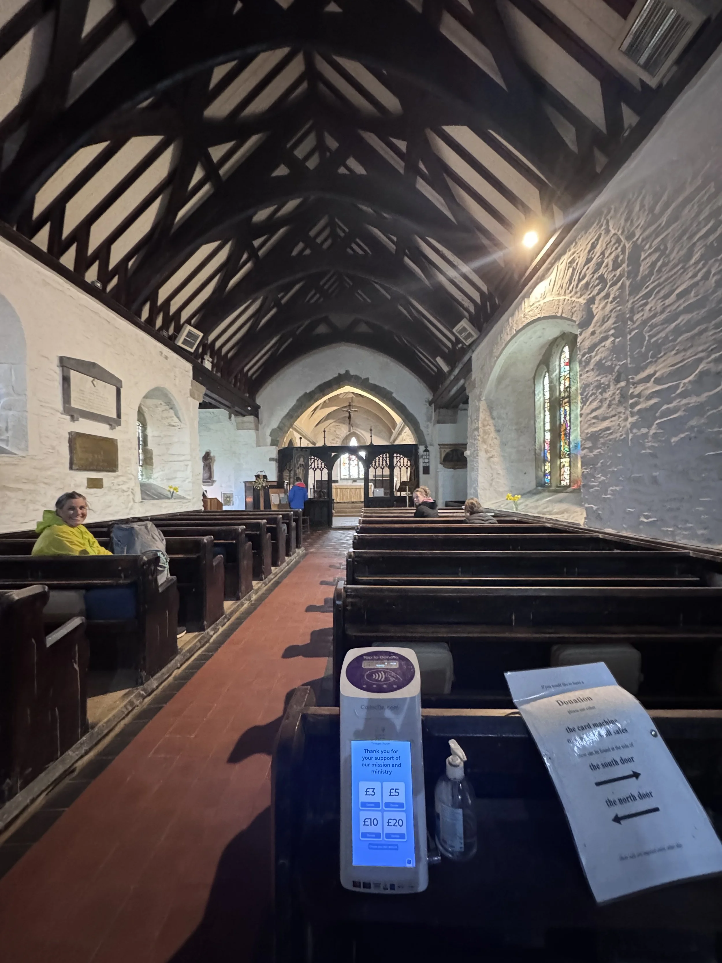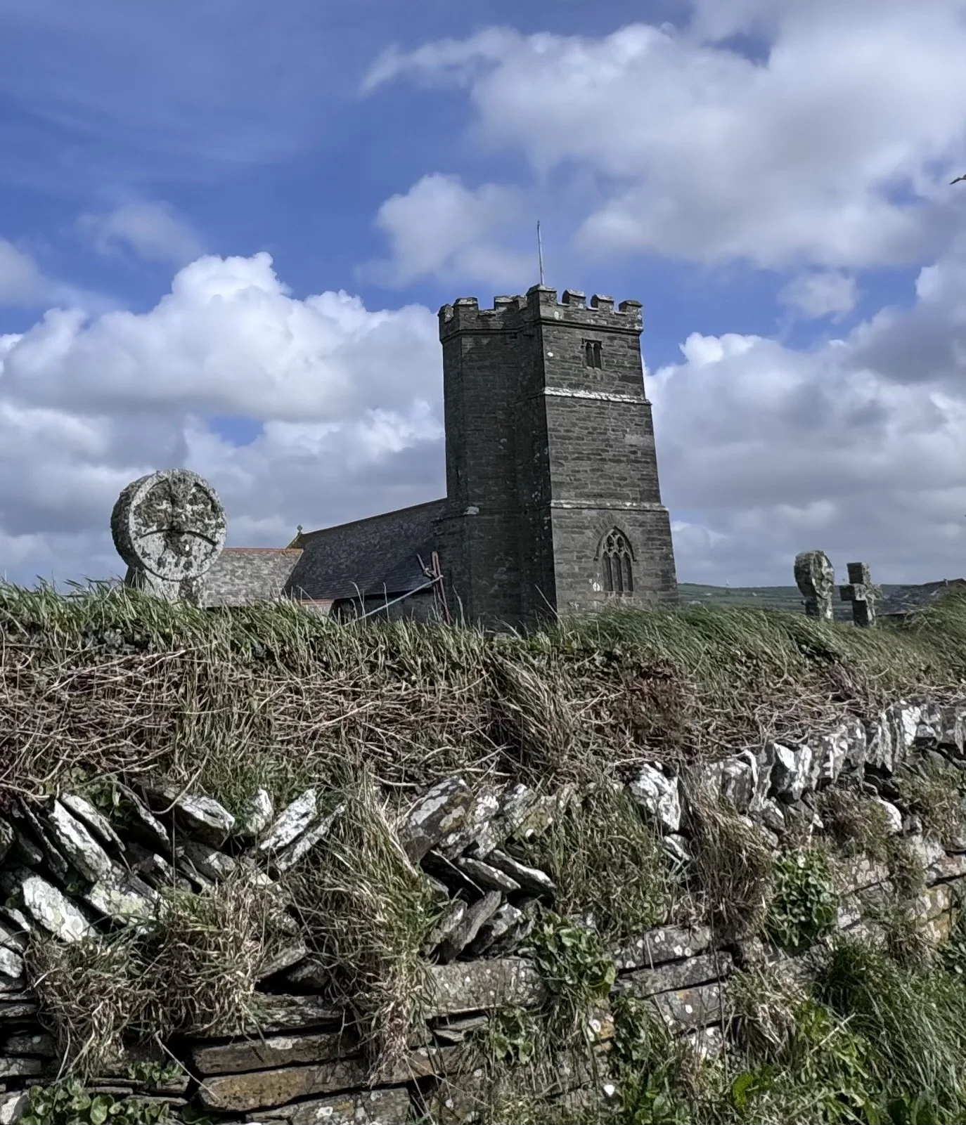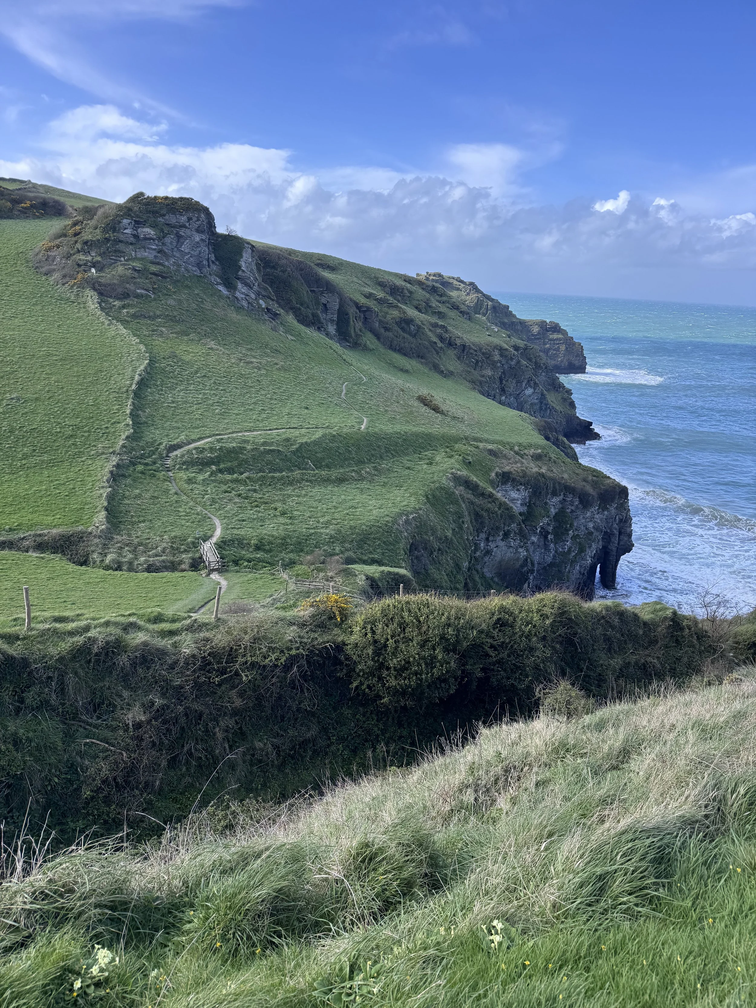 As usual, though, it was a beautiful day. Rain was forecasted but it held off, just a little spitting here and there. Wore my sunglasses most of the route. This was a more remote section of the SWCP, and there were plenty of warning signs for this too, that there was no access to roads for x amount of miles: “take caution”. Highlights of the day: baby bluebells just about to unfurl, Norman (1080) St. Materianna Church that sheltered us for a bit so Kimberly could do some pack readjustments (love it that they take contactless payment for donations!), the Cornish Celtic crosses in the churchyard, the tip from the ice-cream seller in Tintagel to find Bronze Age labyrinths carved into a hillside up Rocky Valley 2 miles further along the coast path, having to divert from a field of very large cows to a field of sheep whom we scared into a cacophony of baa-ing, and ocean spray that was being blown up the steep valleys that looked just like snowflakes falling upwards. Sadly Impossible to get a photos of the last two.