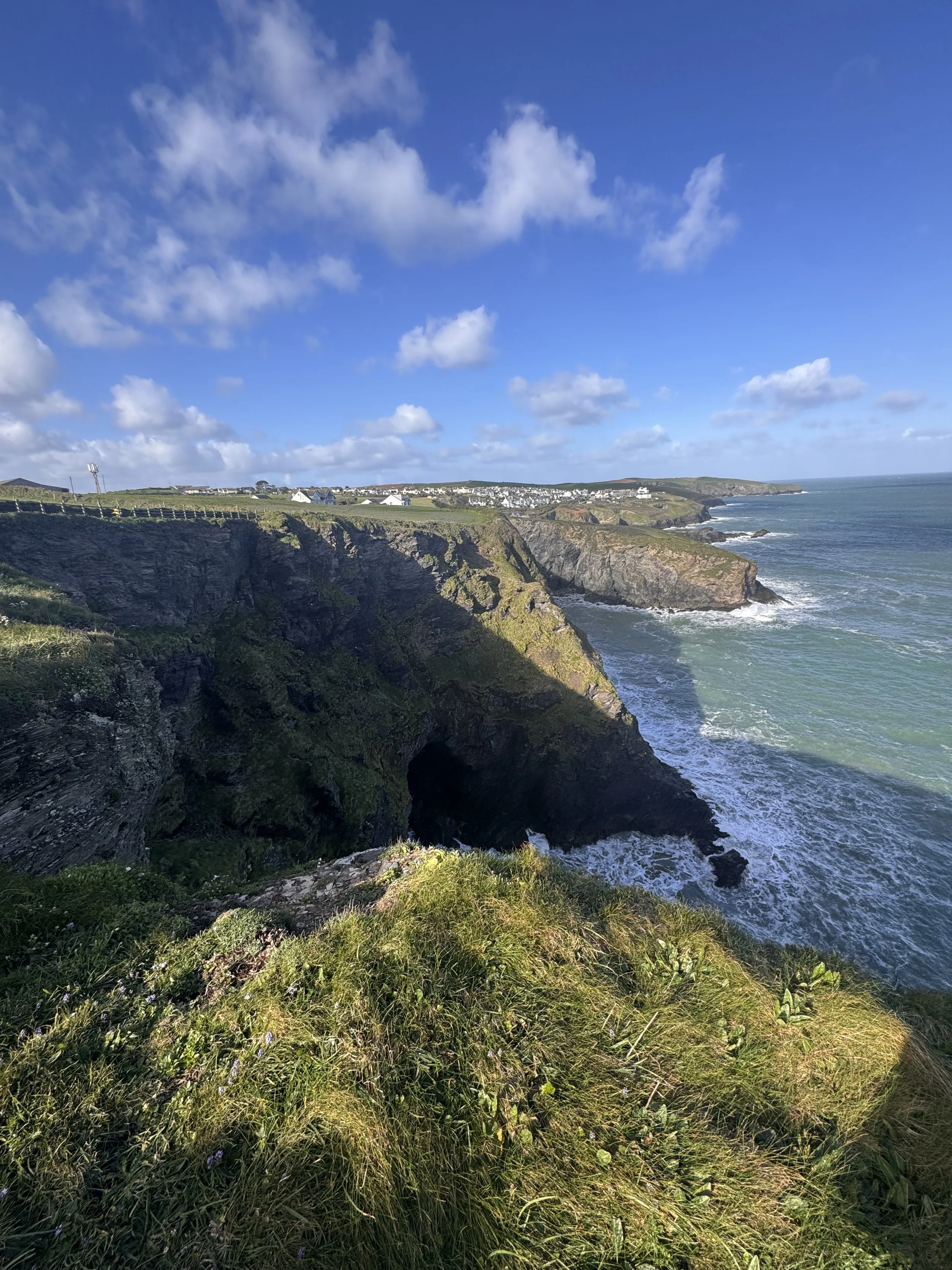 Oh no! Woke with beginnings of a cold! The joints & muscles of the body feeling strong, but that icky, headachey cold-y sensation threatens to derail me now. Nothing for it though, but to drink lots of orange juice at the fab hotel breakfast (delicious eggs Benedict), and head up the hill back to the cliff tops. Turns out that very fresh air blowing at 30mph with gusts of 45 is great to flush out any cold symptoms! Completed a long 14.1 mile day in 9hrs. 8 for walking and 1 spent in the pub in Trebarwith Strand staring out at the ocean while eating my second amazing meal of the day and toasting our progress over a fancy spritzer drink.