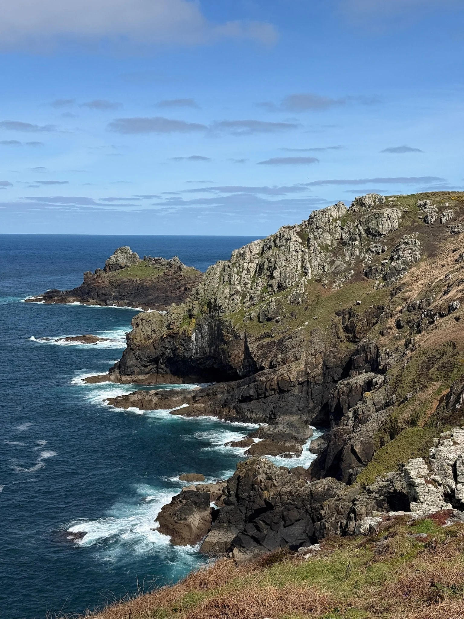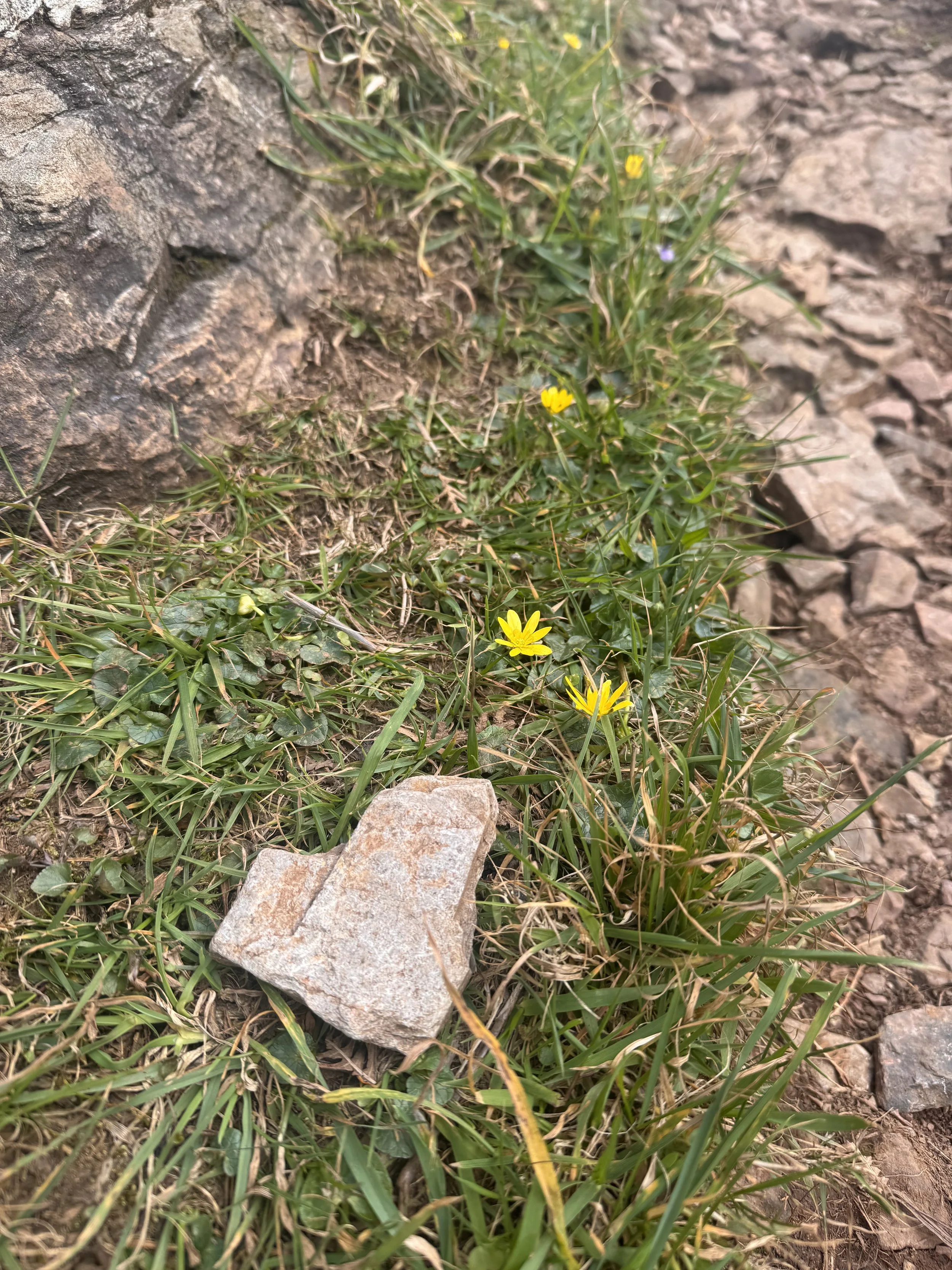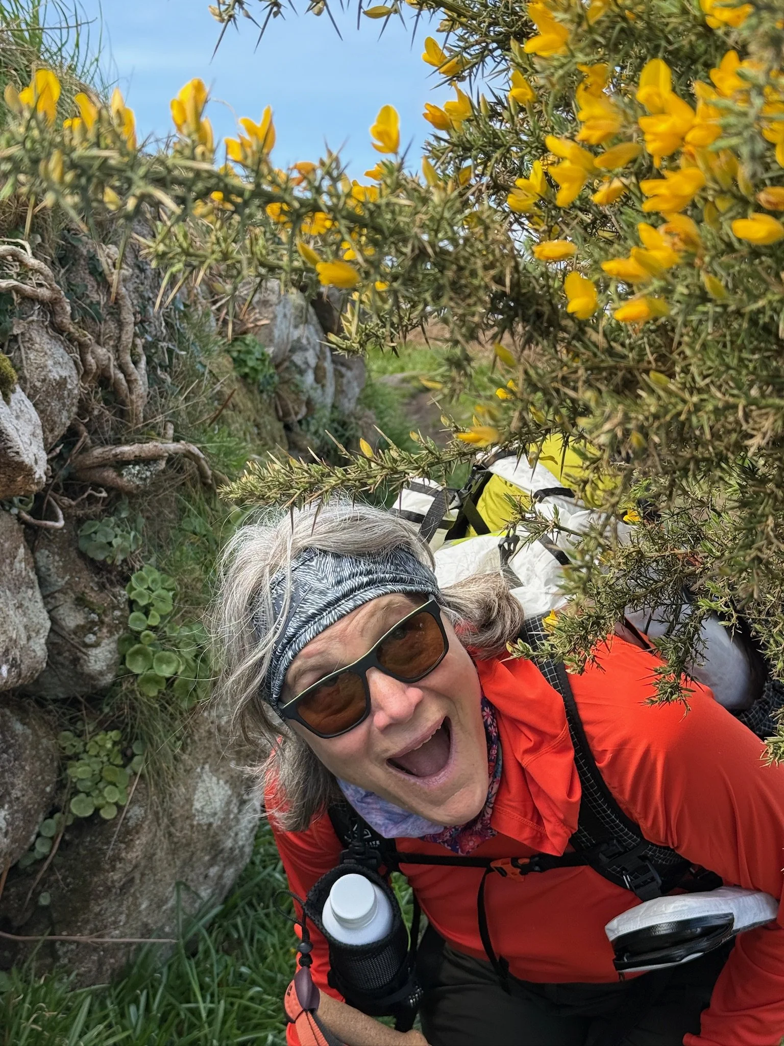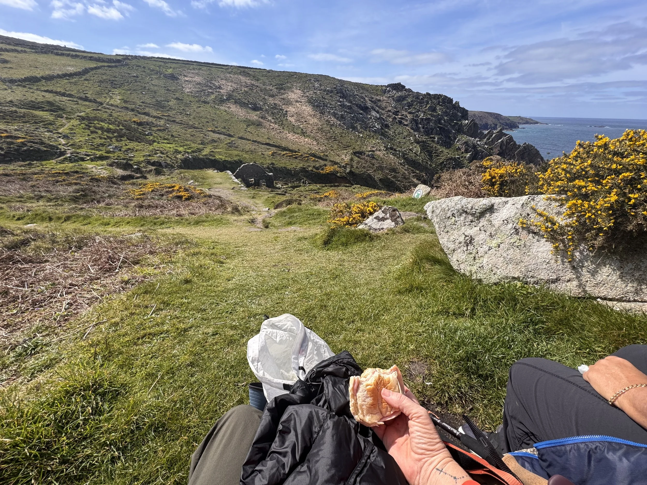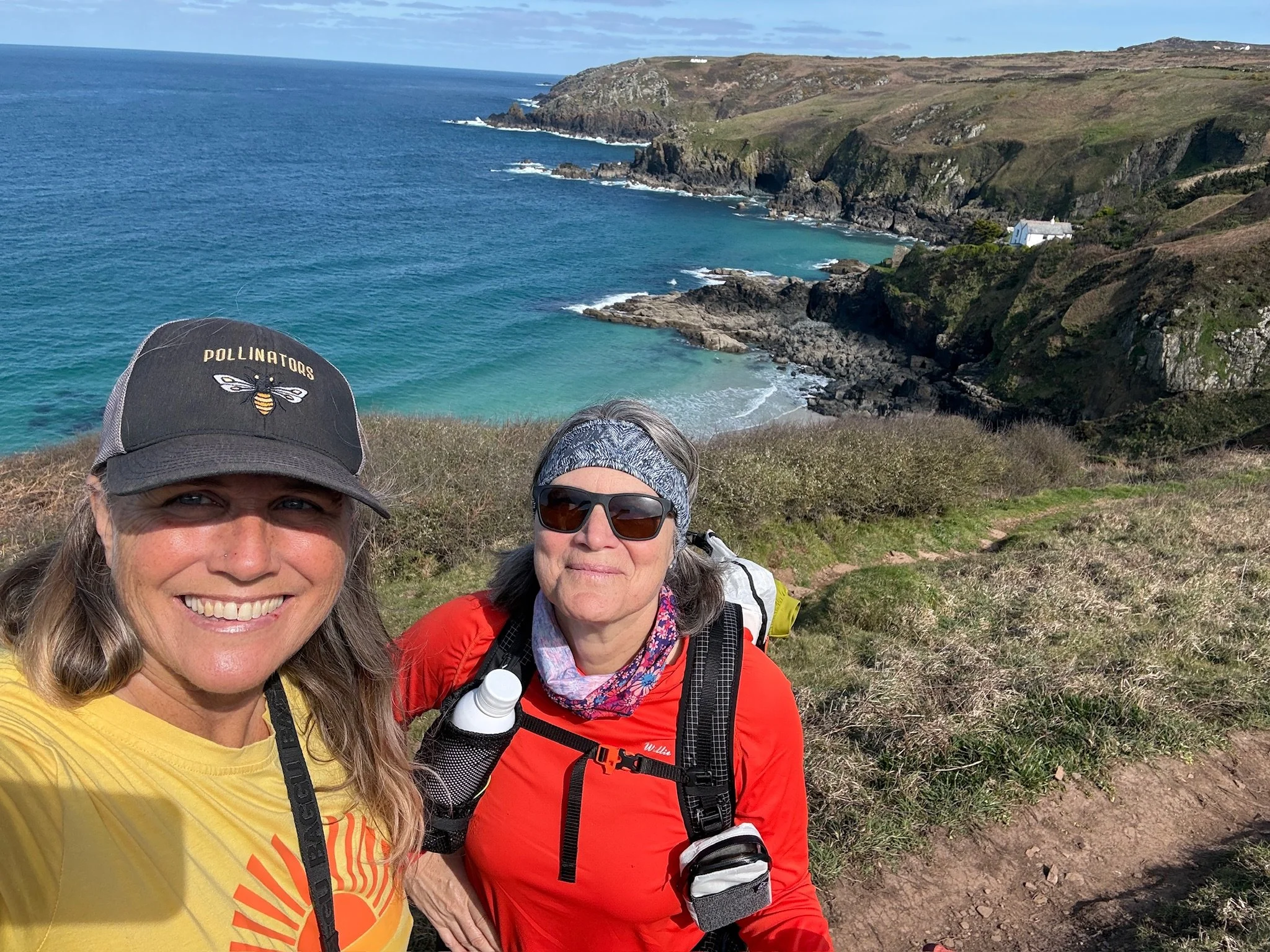 9 1/2 hrs with a 15 min lunch stop, 14.5 miles, and our tent was up before dark and rain came in. I’m beat, this will be a short post. One of the most beautiful coastline stretches in the world, I think it could be titled ‘Beauty and the Bogs’. And rocks. Lots and lots and LOTS of rocks. We took so many photos because every crest of the cliff tops brought more views of amazing blue water, sandy coves, green hillsides scattered with flowers cascading to the water that it was slow going. When the oohs and ahs didn’t stop us in our tracks, the deeply (no joke) wet ground of the bogs did. And the rocks, all sizes of rocks, were a serious impediment to our speedy progress. But, that was fine with me because looking down at a slow pace helped me notice that for some marvelous reason the rocks on this coast have a strong propensity to cleave into heart shapes. This path is filled with love! And it shown down on us all day with the most gloriously sunshine. I think this was the longest and hardest walk I’ve ever done. And I feel great. Sore, but still great and ready for a good night’s sleep in a tent with the rain pitter pattering. The skies just opened. It will be a wet walk tomorrow, but for now I’m basking in today.