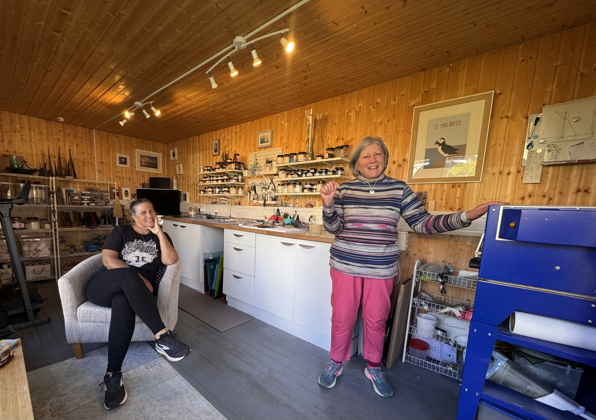Upon returning to Suzanne’s we had a tour of her glassworks studio at the end of her garden ‘Harley House’, named after her gorgeous ginger cat. He joined us to show off his favorite warming place. She also showed us the little hedgehog trail and homes that her neighbor and she have created between their gardens. They have a ‘hedgehog cam’ to see what they’re up to at night. Hilarious antics are always happening down there in the dark hours!