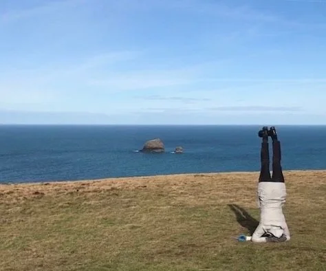 Tomorrow they are going to drop us off a little further up the path, so I will miss about 10 miles of coastal path. But I’m not a purist, as mentioned in an earlier post, and as it turns out, I’ve actually walked along parts of this coastal segment before in 2019 when visiting Suzanne. I’ll include a few photos of that trip below so you can see what it looks like. I even did a headstand then, staring out to sea upside down! Sometimes it helps to take a different perspective, and today I had to take the perspective that caring for my body is more important than tracking every mile of this journey on foot.