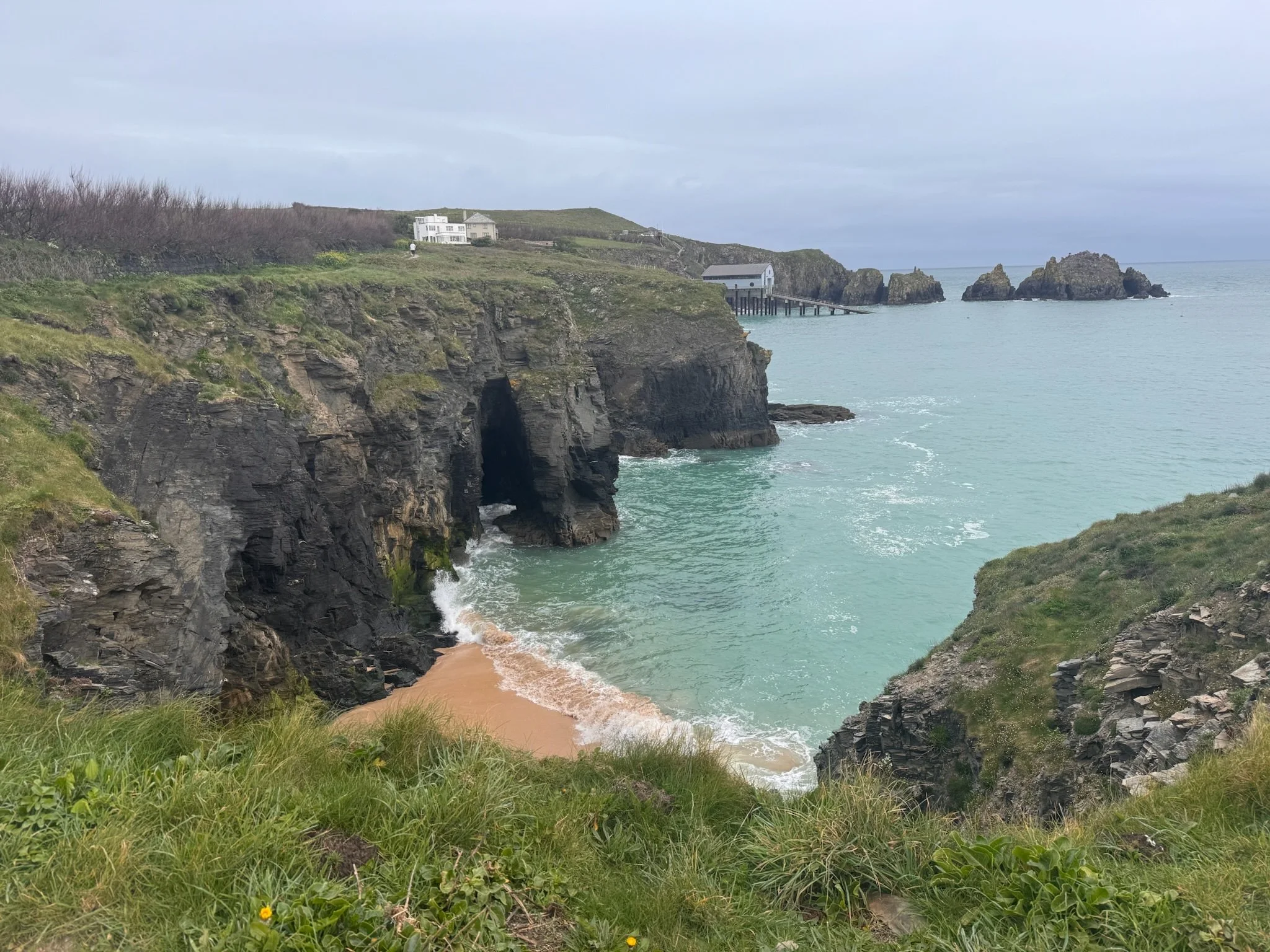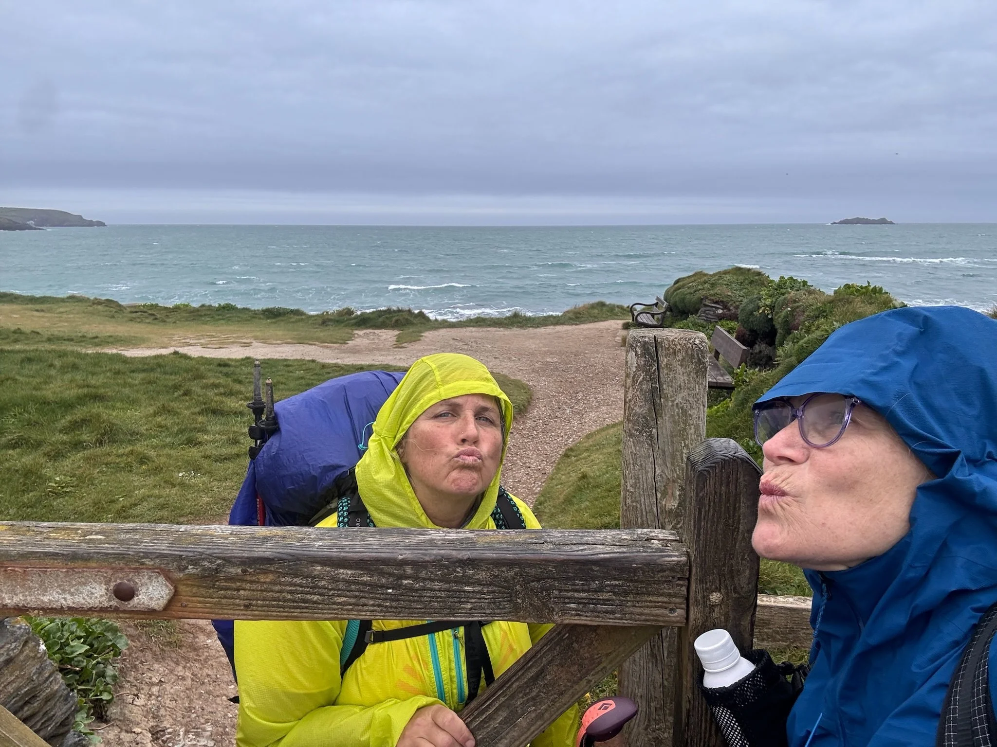 We are camping tonight on a very rustic farm inland a bit, just south of Padstow. Shortly after the junction to turn off the SWCP (abbreviation of the official name of the South West Coast Path) we knew there was another tidal pool and decided to continue on a bit to see if it was possible for Kimberly to take a cold dip. Nope. The tide was high and waves rough. It had also started misting so heavily it was essentially rain. Glad we saw it, we turned around and headed back to the turn off.