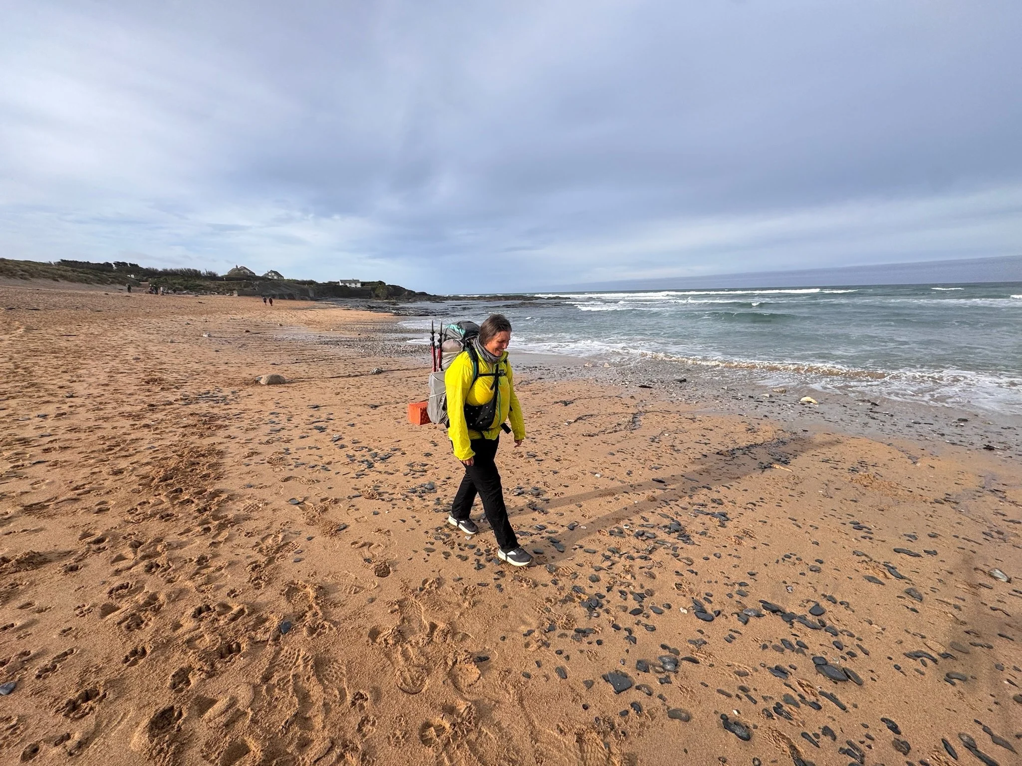 Kimberly sadly looking at all the stones on Constantine Beach, knowing she can’t collect any because she still has many days to go with a pack on her back.