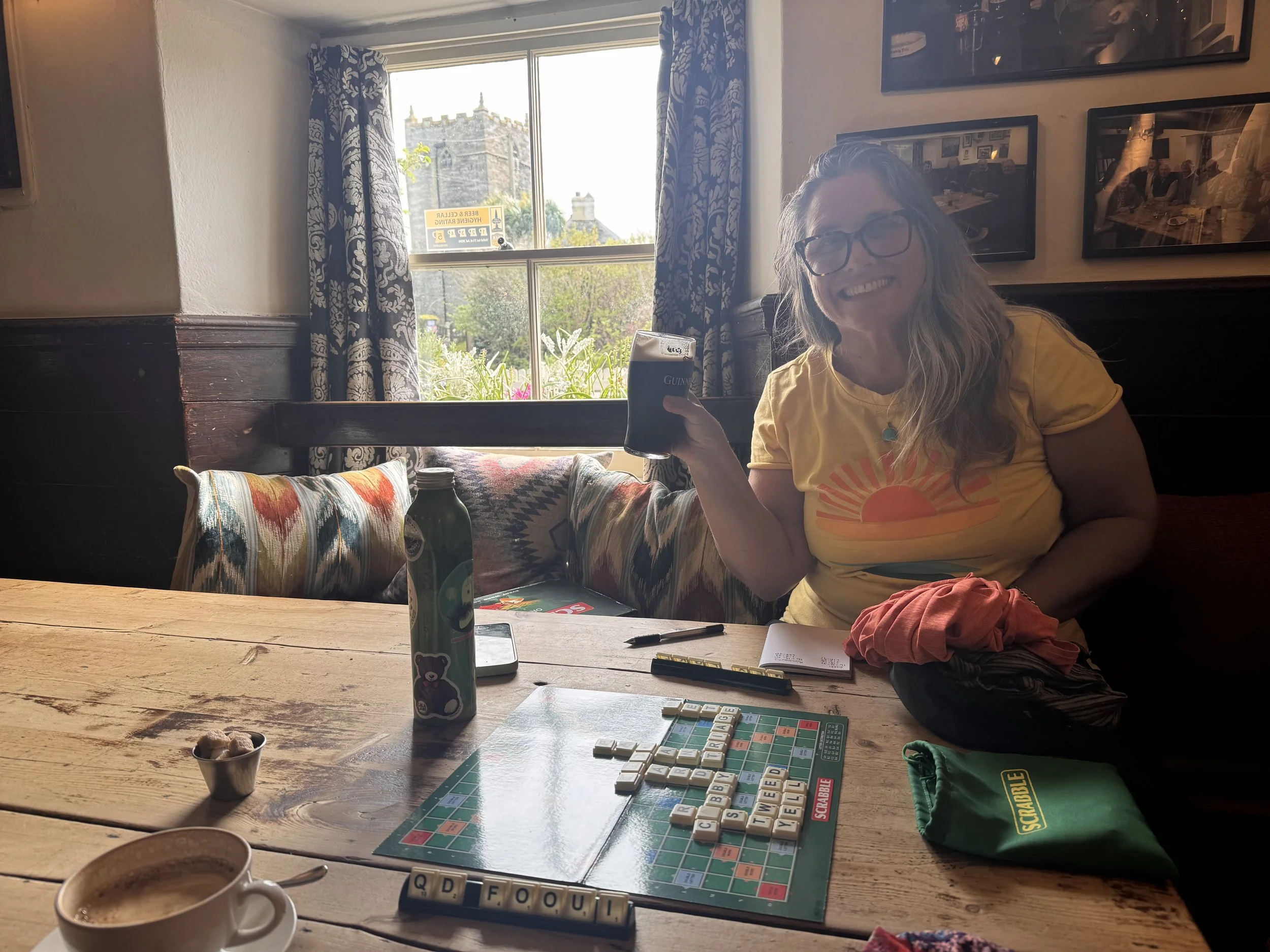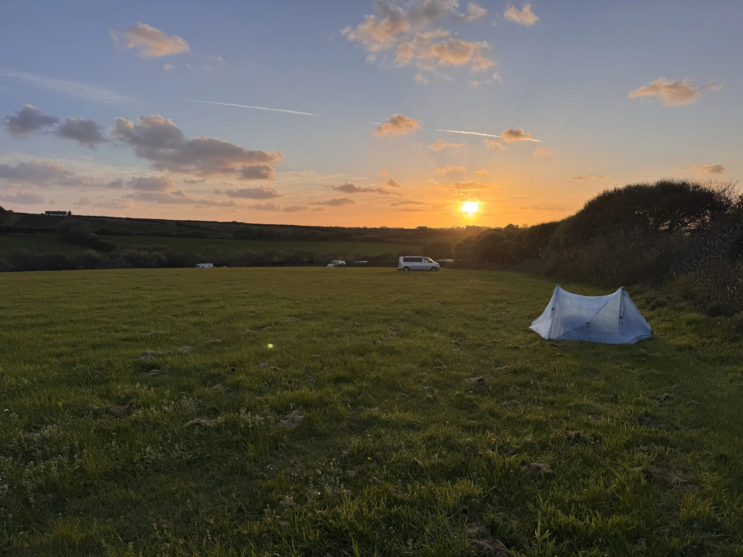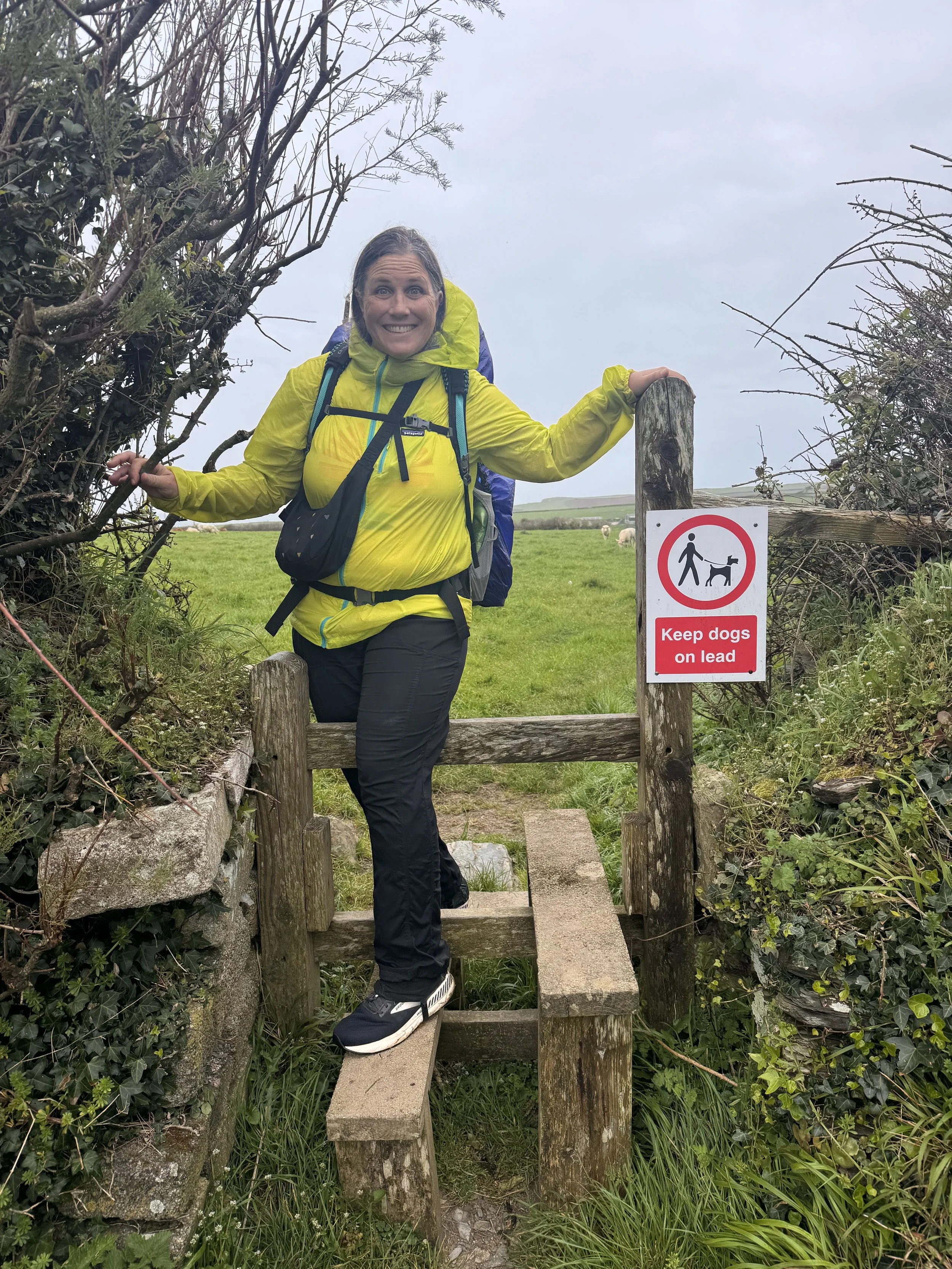 The rest of the morning was great: the sun broke through a bit, paths through fields (kissing gates & stiles to navigate) and along quiet one lane roads. We picked up bread, cheese & ham in the one tiny shop we walked by for dinner in our tent, and then suddenly came across a country pub, like you do. This one though ‘The Cornish Arms’, happened to be run by the famous chef Rick Stein. We were making good time, too good actually and we didn’t want to spend hours hunkered down in our tent so we availed ourselves of the warm pub hospitality and ate, drank, played scrabble, sat by the fire, used the internet. Three and half hours passed.