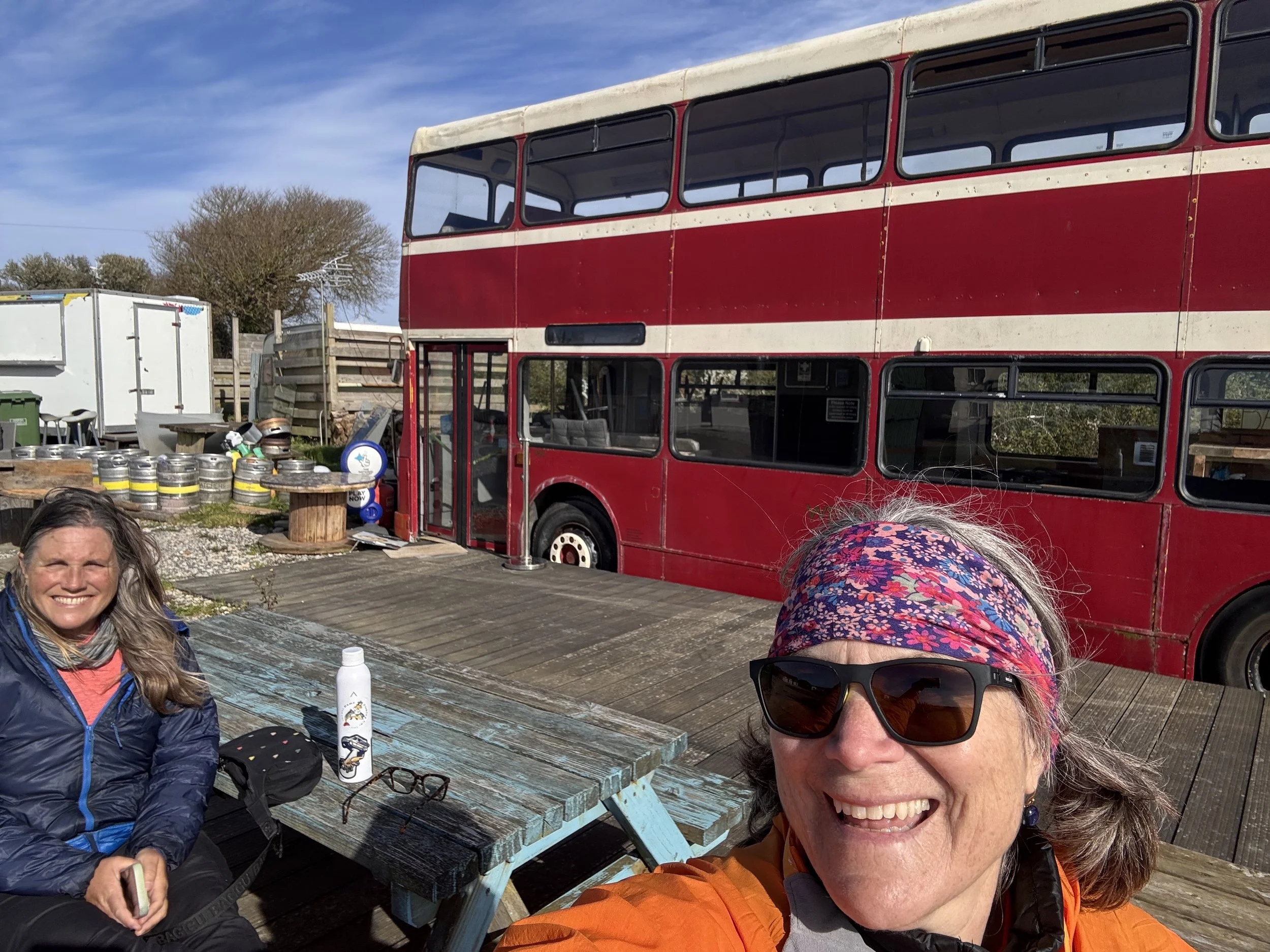 Solid blue sky drew us out and we walked the couple miles to our farm campsite. We saw pretty flowers beside the trail and a house with really big stones. Arrived at our minimalist campsite, tent set up, hanging out by the double decker bus stranded here in the field for a second life as a bar (sadly closed till summer), and the cold wind is picking up so soon I will take shelter in our little blue tent and make it an early night.
