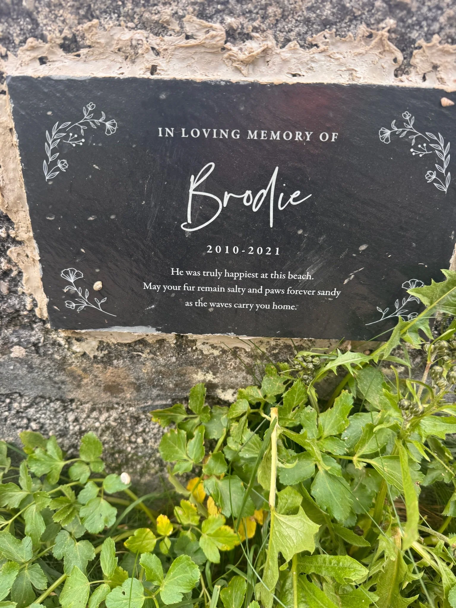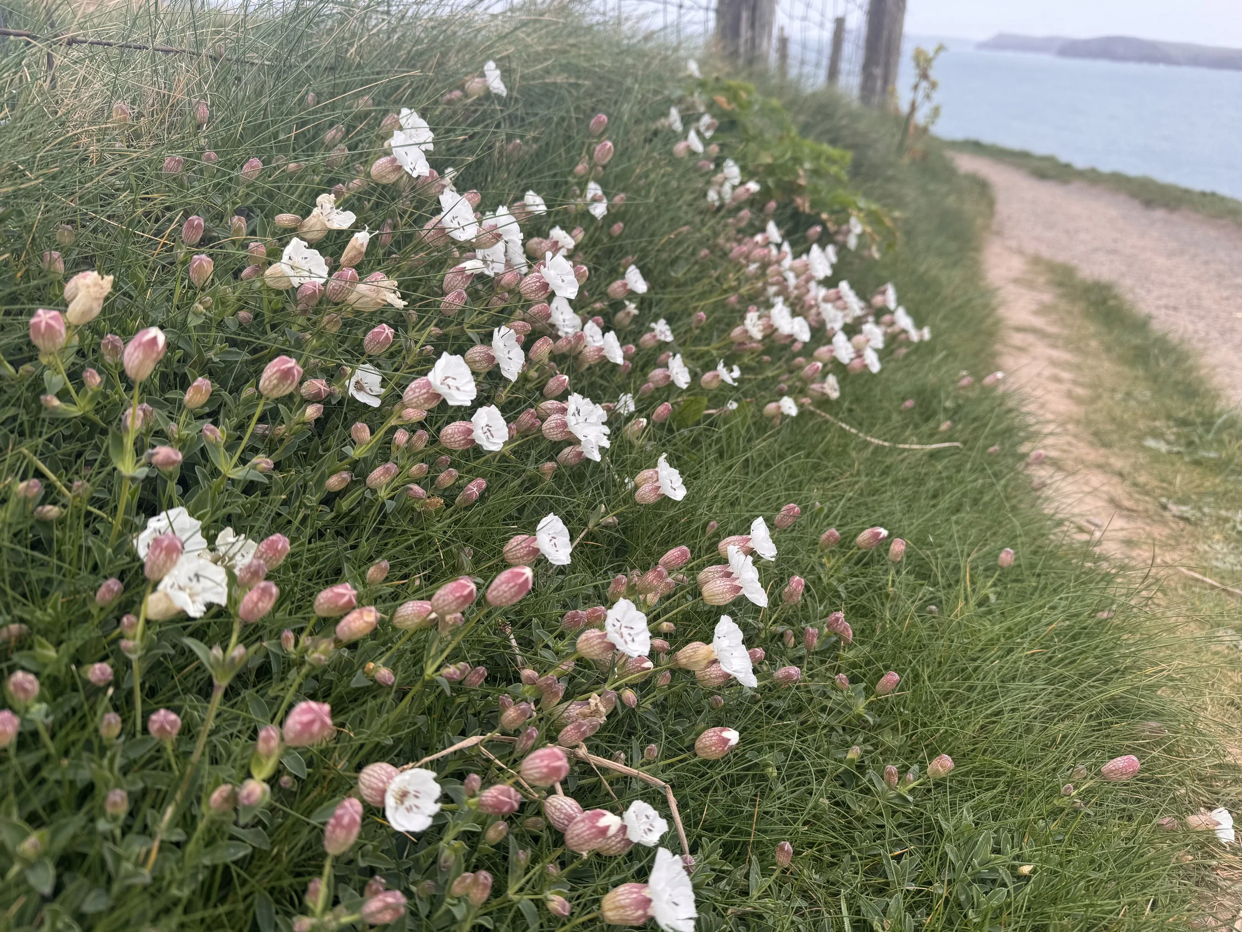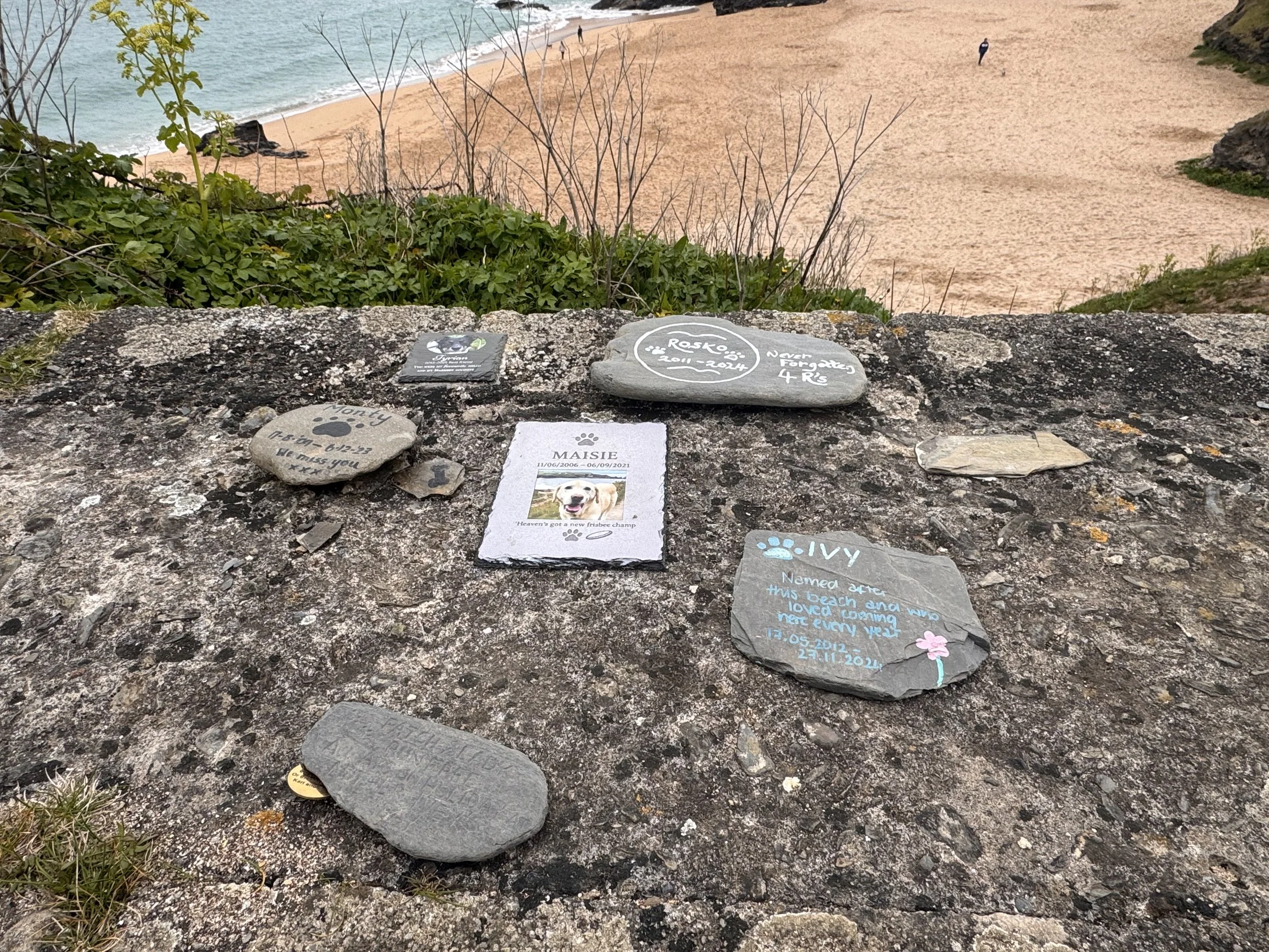 We were hoping for the famously great views SW to St. Ives and NE to Bude, but the mist was thick. When we saw a footpath sign ‘1 1/4 miles to Mother Ivey’s Bay’ cutting off the peninsula, we took it. Great decision! When we popped out back on the coastal path and the little cove of Mother Ivy’s Bay in front of us was adorable! The path was soft, flat, and the views so pretty, weaving in and out of little coves - without descending to the beach. Yay! More and more dogs out enjoying the morning, owners trying to keep up behind them. And then we came across the sweetest, saddest memorial to all the dogs who have dearly loved these beaches and have now gone to doggie heaven.
